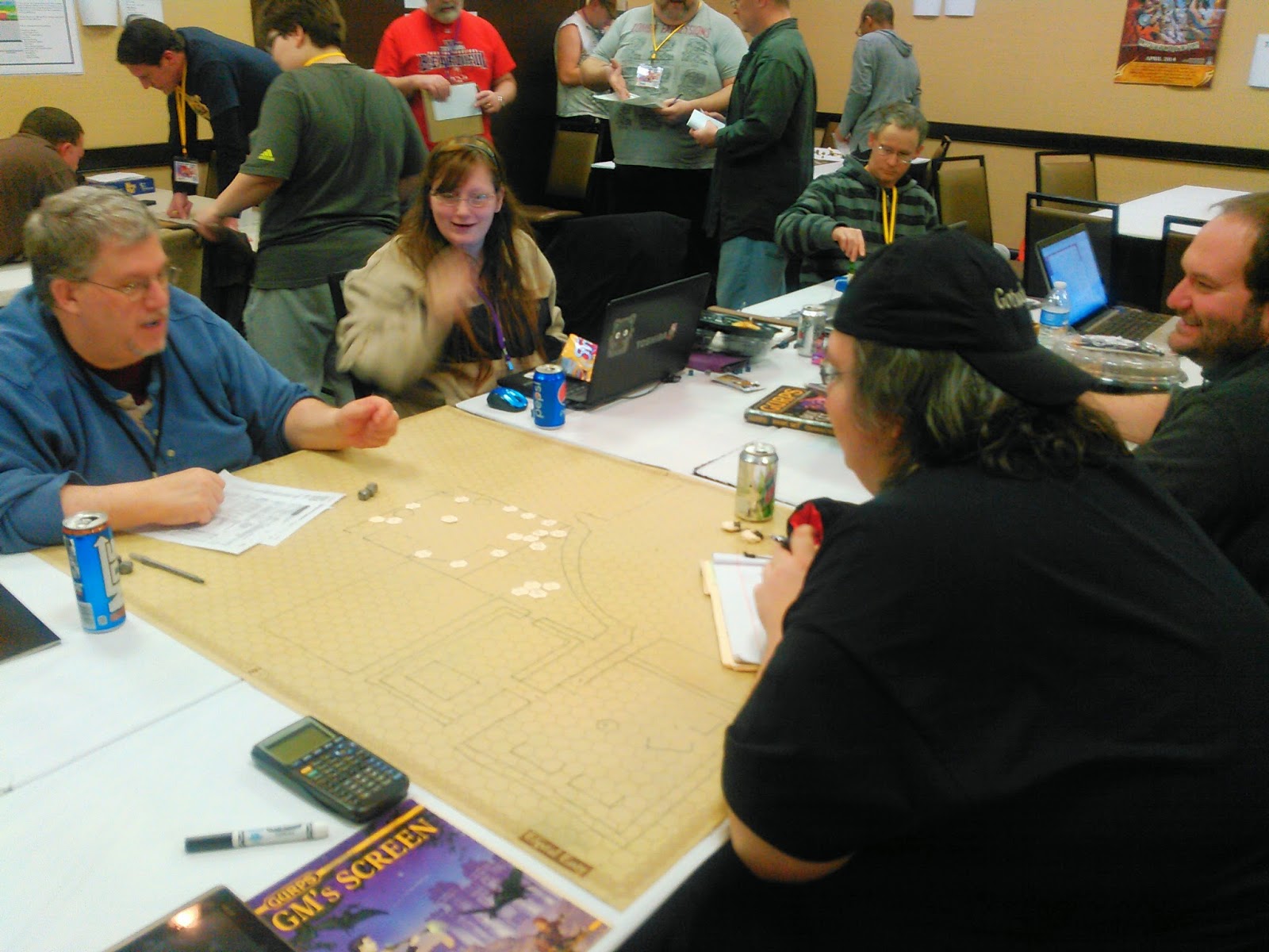So I signed up, started working on some material, and pregenerated characters (and got some great help from some forum folks, thanks DAT and Bruno!). Of my gaming group, I only got three to go (L.A., my adversary/co-GM and two experienced players to help me shepherd folks, C. and Troythulhu) and everything was going great. Then, L.A. had a death in the family and I thought we might have to cancel. But my brave girl, that wonderful strong-willed, indomitable woman of mine did what she always does and soldiered on. I shouldn’t have ever thought otherwise. It wouldn’t have mattered to me either way at that point, she’s just more important, you know? But we made it to the Con. There were SO many people there. My hypervigilance kicked off and I thought I was going to have a panic attack or punch someone, but she was there and so were my best friends and I thought “damn, if she can do it after [today], so can I.” I reined it in, centered myself, and got calm. Getting our badges was a little difficult (we’d been comped thanks to Steve making us staff), but after running around some, we got it figured out and I began to set up in the tabletop room. It was as I’d feared: a pretty small room with lots of tables and a ton of people. I was so sure that no one would show up that Friday and I’d end up demoing nothing.